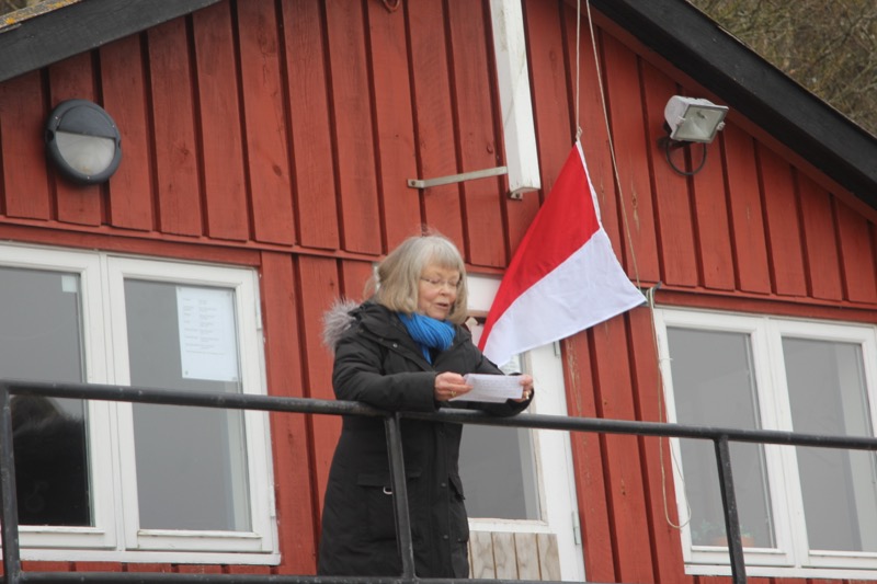 Erik formand var i Bruxelles, så næstformanden (Karen Margrethe) måtte i arbejde og holde talen. Lisette og Annette (in absentia) skulle hejse standeren. De har knoklet hele vintersæsonen med at holde os i form ved rospinningen, så tak for det.